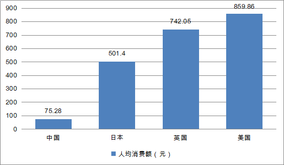 從消費額來看,中國休閑食品人均消費額為75.28元,而日本、英國、美國的該數(shù)額分別是501.4元,742.05元和859.86元,差距較大。