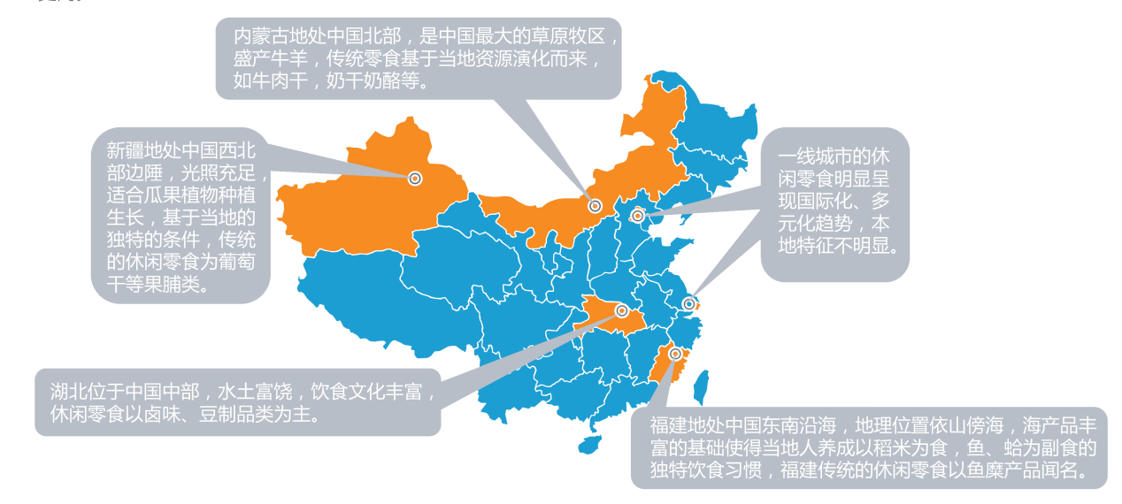 休閑食品的生產(chǎn)與農(nóng)業(yè)資源緊密相連。不同的地域有著截然不同的農(nóng)業(yè)資源,產(chǎn)業(yè)集中度較高,由此形成了眾多具備獨特資源優(yōu)勢的休閑食品品類,引領(lǐng)著中國休閑食品的發(fā)展潮流。目前,已經(jīng)興起了諸如福建軍團(tuán)、安徽炒貨軍團(tuán)、湖南辣食品、河南速凍食品軍團(tuán)等一大批優(yōu)秀的休閑食品企業(yè)。