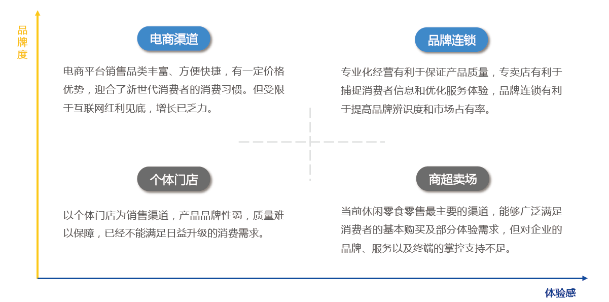 休閑零食的渠道陣營主要有四大類:傳統(tǒng)的個體門店和商超賣場,新興的品牌連鎖和電商渠道。在新零售浪潮的沖擊下,四大陣營此消彼長,個體門店的市場份額不斷縮減,商超賣場的渠道影響力也將減弱,品牌連鎖和電商渠道將成為未來休閑零食新消費的主流渠道。