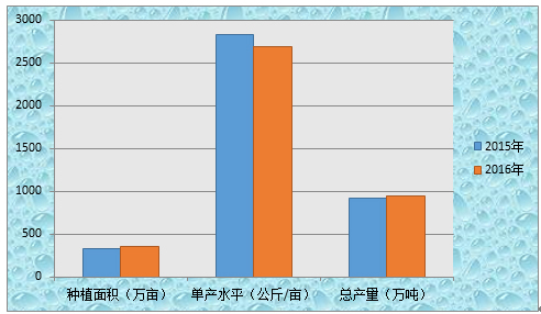圖1  2015年、2016年中國(guó)生姜種植面積、單產(chǎn)水平及總產(chǎn)量