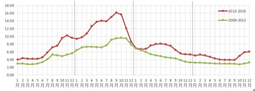 具體來(lái)看,2016年初生姜上市平穩(wěn),供應(yīng)持續(xù)增加,價(jià)格穩(wěn)中略降,主要原因是2016年生姜供應(yīng)面異常充足,而需求面持續(xù)表現(xiàn)低迷,且參市各方購(gòu)銷積極性均受其打擊,導(dǎo)致整個(gè)老生姜交易階段的價(jià)格保持低位。新生姜上市之初,開(kāi)秤價(jià)格并無(wú)優(yōu)勢(shì),直到后續(xù)因積年庫(kù)存吃緊和新老交替青黃不接的斷口期出現(xiàn),加之高種植成本下的連年低價(jià)使姜農(nóng)惜售情緒見(jiàn)長(zhǎng),才逐漸抬升生姜市場(chǎng)行情。