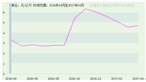 據(jù)全國(guó)農(nóng)產(chǎn)品批發(fā)市場(chǎng)價(jià)格信息網(wǎng)提供數(shù)據(jù),2016年4月至2017年4月,寧夏生姜價(jià)格趨勢(shì)與我國(guó)生姜價(jià)格總趨勢(shì)保持一致,如圖5所示。區(qū)內(nèi)生姜價(jià)格最高價(jià)出現(xiàn)在2016年12月15日,為7.2元/公斤,由吳忠市鑫鮮農(nóng)副產(chǎn)品市場(chǎng)有限公司上報(bào);市場(chǎng)最低價(jià)出現(xiàn)在2016年6月15日,為2.3元/公斤,由銀川北環(huán)批發(fā)市場(chǎng)上報(bào)。
