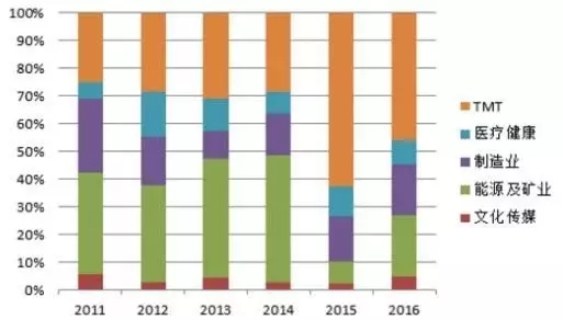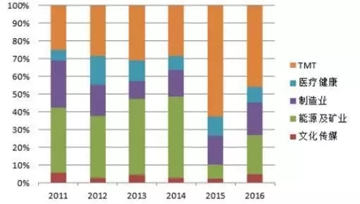 在國內(nèi) PE 投資方面,2016年TMT 行業(yè)投資熱度有所降低,但這與 2016 年市場整體投資節(jié)奏放緩有一定關(guān)系。如果從投資 的行業(yè)占比來看,TMT 和制造業(yè)仍然是最受投資機構(gòu)追捧的領(lǐng)域。