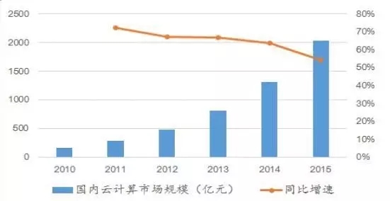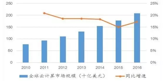 2016 年全球云計算市場規(guī)模達到 2086 億美元,同比增長 17.19%;從 2010 年至 2016 年,全球云計算的年 均復合增速達到 18.08%。而國內(nèi)云服務(wù)市場規(guī)模從 2010 年至 2015 年年均復合增速為 64.74%,領(lǐng)先全球增速。