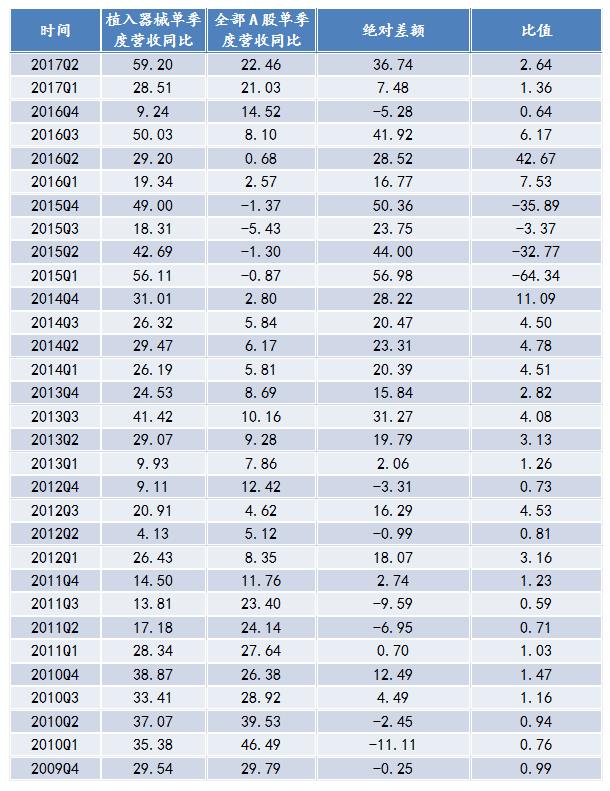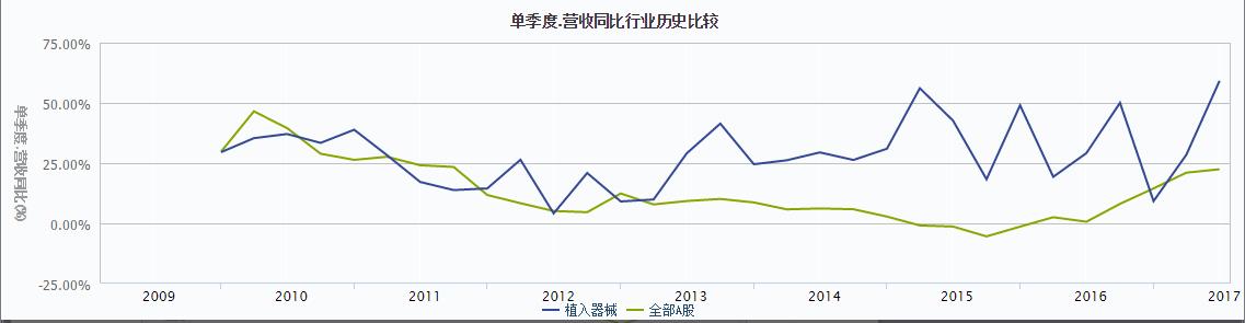 根據與全部A股營收相比較,在2012年之前,植入器械的營收總體上與全部A股的保持一致。2012年之后,全部A股的營收變動相對平緩;而植入器械行業(yè)營收基本高于全部A股營收,在2016年經歷谷值之后,行業(yè)保持增長的趨勢。
