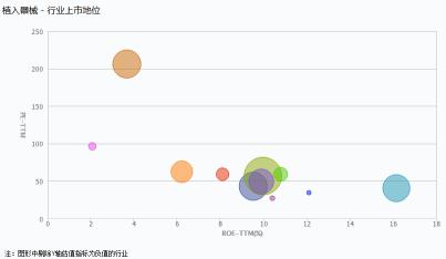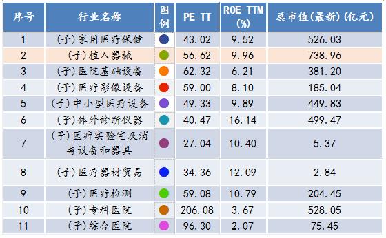 植入器械行業(yè)市盈率(PE)為56.62,其凈資產收益率為9.96%,相較其他行業(yè)而言處于中等位置;植入器械行業(yè)的總市值為738.96億元,相較其他行業(yè)而言,處于較高水平。