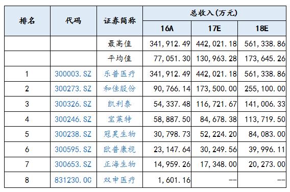 通過對植入器械上市公司的盈利做出預測,上市公司總收入的平均值在2017年、2018年預計分別是130,963.28萬元、173,645.26萬元,相對于2016年的77,051.30萬元,呈現逐年增長的趨勢;其上市公司盈利最高值預測值在2017年、2018年分別達到442,021.18萬元、561,338.86,相較于2016年的341,912.49萬元,呈現逐年增長的趨勢,市場總體看好植入器械上市公司。