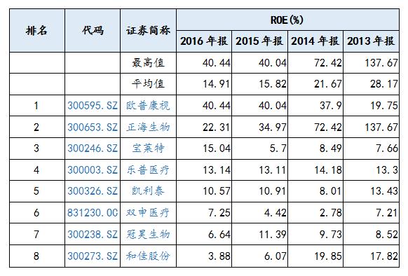 根據植入器械行業(yè)上市公司年報數據顯示,上市公司凈資產收益率平均值在2013年至2016年分別為28.17%、21.67%、15.82%、14.91%,凈資產收益率最高值在2013年至2016年分別為137.67%、72.42%、40.04%、40.44%。