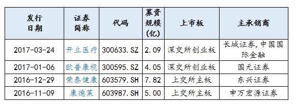 從2016年8月17日至2017年8月17日,植入器械行業(yè)上市公司股權融資主要有開立醫(yī)療、歐普康視、榮泰健康、康德萊,分別是深交所創(chuàng)業(yè)板、上交所主板的上市公司,通過IPO方式融資,募資規(guī)模分別為2.09億元、4.05億元、7.82億元、5.00億元。