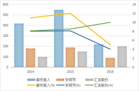 考慮到使用萊卡材料內(nèi)衣企業(yè)主要是中高端企業(yè),企業(yè)占市場份額較大,數(shù)據(jù)可獲取等因素,本部分主要針對中高端內(nèi)衣企業(yè)安莉芳集團(tuán)(以下簡稱為:安莉芳)、深圳匯潔集團(tuán)股份有限公司(以下簡稱為:匯潔股份)、大眾性企業(yè)廣東都市麗人實(shí)業(yè)有限公司(以下簡稱:都市麗人)進(jìn)行分析。