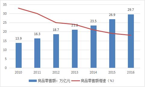 2010年—2016年中國(guó)商品零售額及增速走勢(shì)