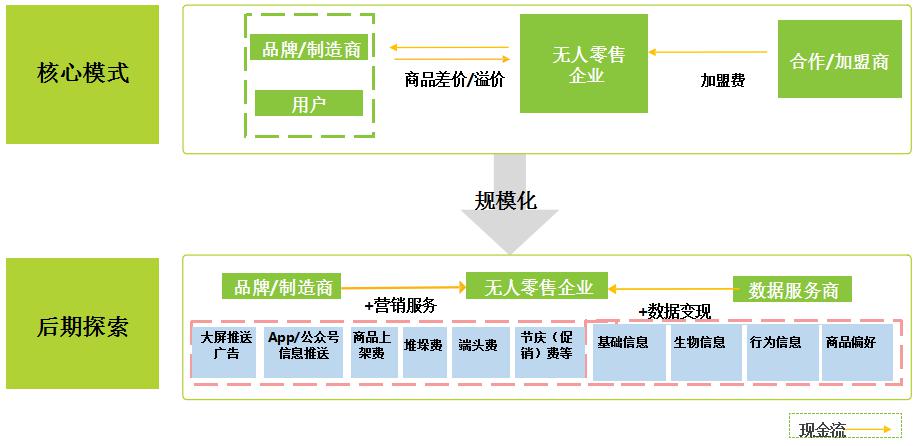 無(wú)人零售企業(yè)收入來(lái)源以銷(xiāo)售商品賺取差價(jià)為主,并且通過(guò)規(guī)?;岣咦h價(jià)能力降低采購(gòu)成本。此外,從加盟商獲取加盟費(fèi)用的商業(yè)模式也已經(jīng)開(kāi)始推行。無(wú)人零售發(fā)展至中后期,企業(yè)數(shù)據(jù)更為龐大,其盈利模式將隨之產(chǎn)生更多的想象空間,以互聯(lián)網(wǎng)思路開(kāi)展?fàn)I銷(xiāo)服務(wù)、數(shù)據(jù)變現(xiàn)等都是比較成熟的可參考模式。