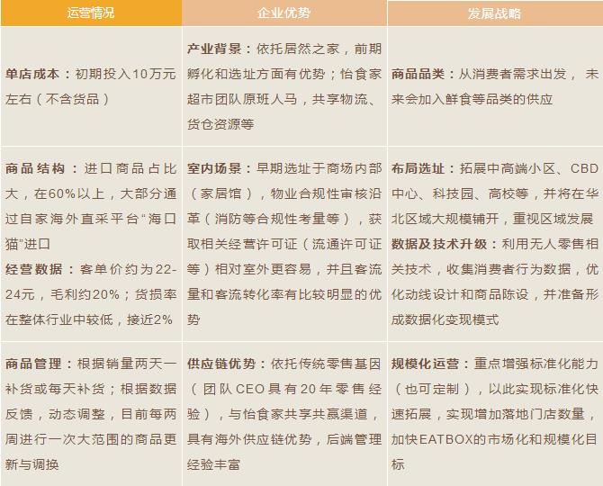 EATBOX由居然之家于2017年7月推出,定位于中高端小區(qū)、高校、CBD及科技園等。EATBOX 首店面積約30平米,設(shè)有9個(gè)貨架、2臺(tái)冰柜,主要銷(xiāo)售零食、飲料酒水、日化等商品,SKU約600~700個(gè),進(jìn)口商品SKU約400個(gè)。