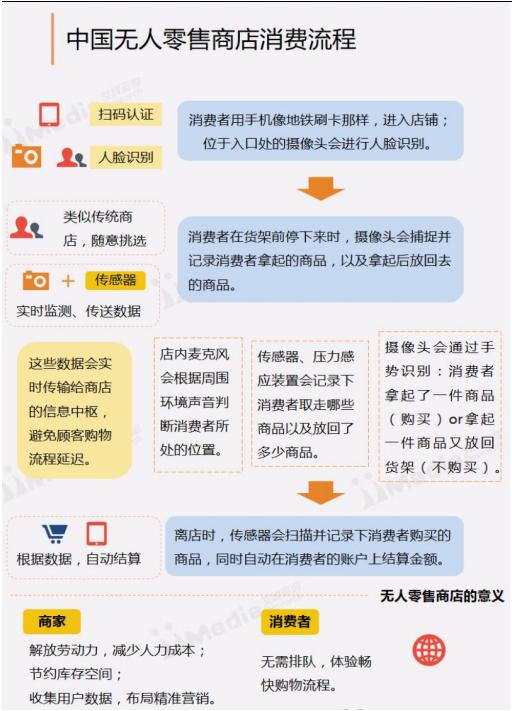 國(guó)內(nèi)目前的無(wú)人零售店的消費(fèi)流程主要分為:掃碼認(rèn)證或人臉識(shí)別、挑選商品、根據(jù)數(shù)據(jù)自動(dòng)結(jié)算這些環(huán)節(jié)。對(duì)于商家而言,可以節(jié)約人力成本和沉淀消費(fèi)數(shù)據(jù),對(duì)于消費(fèi)者而言,則可以增強(qiáng)體驗(yàn)感和減少排隊(duì)時(shí)間。