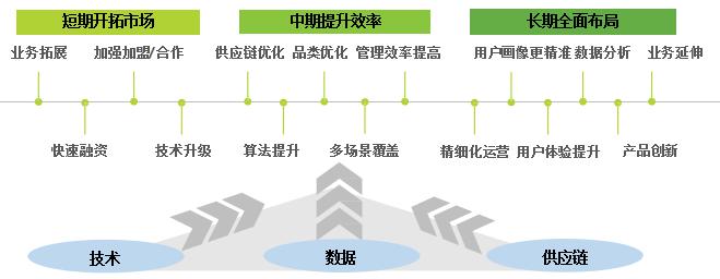 中期:企業(yè)的運(yùn)營(yíng)重點(diǎn)在于供應(yīng)鏈與管理效率的提升,包括企業(yè)進(jìn)行技術(shù)算法提升,并將供應(yīng)鏈進(jìn)行網(wǎng)狀轉(zhuǎn)變,同時(shí)擴(kuò)充或開(kāi)發(fā)零售多場(chǎng)景,覆蓋主要消費(fèi)場(chǎng)景,品類、商品組合進(jìn)入精選模式,根據(jù)不同用戶個(gè)性化/精準(zhǔn)化推送等。