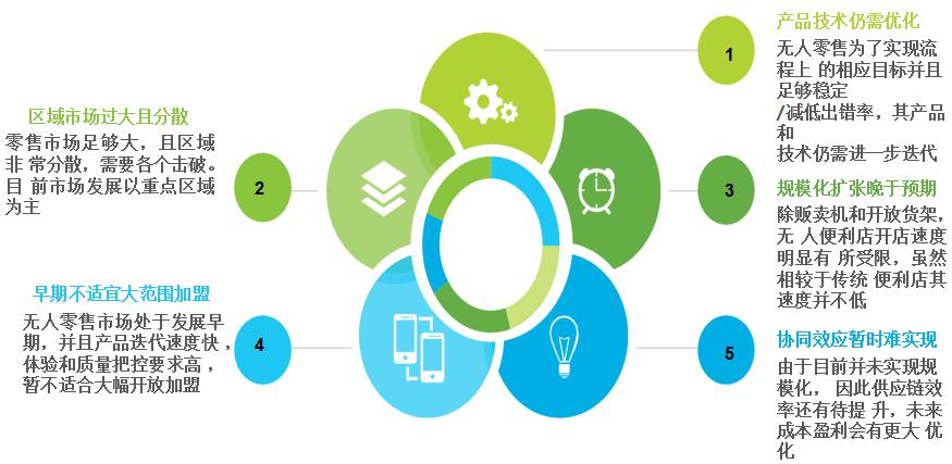 無(wú)人零售市場(chǎng)整體看好,但發(fā)展仍受到一定困阻典型優(yōu)質(zhì)企業(yè)能夠起到很好的示范作用,整體無(wú)人零售市場(chǎng)有發(fā)展前景。但目前來(lái)看,不容忽視的是市場(chǎng)剛剛經(jīng)歷一年左右的發(fā)展,還處于前期探索階段,因此還存在一些比較共性的發(fā)展困阻,主要集中在產(chǎn)品技術(shù)優(yōu)化、區(qū)域市場(chǎng)拓展、企業(yè)規(guī)?;l(fā)展、企業(yè)開(kāi)放加盟和供應(yīng)鏈的協(xié)同效應(yīng)。