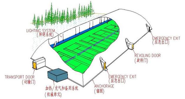 氣膜建筑也稱為“空氣支撐結(jié)構(gòu)”—air supported structure,是以特殊的建筑膜材為建筑外殼,并配備一套智能化的運行控制系統(tǒng)為完全密閉的氣膜建筑內(nèi)部提供空氣壓力,使整體建筑內(nèi)部始終保持對外部環(huán)境的正壓,從而靠內(nèi)、外部壓力差把建筑主體支撐起來的一種建筑結(jié)構(gòu)系統(tǒng)。一套完整的氣膜建筑系統(tǒng)還包括了照明系統(tǒng)和門禁系統(tǒng)。