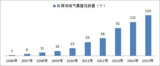 目前,世界上已經(jīng)建成有上萬個氣膜建筑了,2011年以后中國氣膜場地的數(shù)量迎來集中爆發(fā)期,全國每年新增項目數(shù)量基本穩(wěn)定在30個以上。截至2015年末,我國氣膜建筑總項目數(shù)達(dá)到215個,建筑面積達(dá)到88.76萬平方米;其中,現(xiàn)存的項目數(shù)量和建筑面積分別為197個和78.60萬平方米,現(xiàn)存率在90%左右。氣膜建筑可以應(yīng)用的范圍非常廣闊,但是我國目前還是作為運動場館的比較多,市場接受度也比較高。隨著社會對環(huán)保的關(guān)注,企業(yè)經(jīng)營過程中環(huán)保的成本要求越來越高,未來在工業(yè)領(lǐng)域,氣膜建筑還有更廣泛的應(yīng)用。