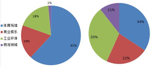 圖表4 氣膜建筑項目數(shù)量(左)、建筑面積(右)各應(yīng)用領(lǐng)域占比