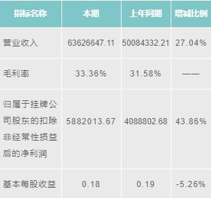 維拓環(huán)境2016年營業(yè)收入為50452048.01元,增長85.36%;毛利潤為31.82%;歸屬于掛牌公司股東的扣除非經(jīng)常性損益后的凈利潤為2701722.12元,增長137.51%;基本每股收益為0.24元,增長137.50%。