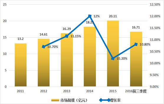 受下游需求市場不斷擴大的影響,近幾年中國α-亞麻酸行業(yè)市場處于快速增長期,2011-2016年前三季度中國α-亞麻酸(80%以上)行業(yè)市場規(guī)模增長率在10%-13%之間。其中,2014年中國α-亞麻酸(80%以上)行業(yè)市場規(guī)模18.25億元,2015年中國α-亞麻酸(80%以上)行業(yè)市場規(guī)模20.11億元,同比增長10.2%,行業(yè)市場發(fā)展情況較好。