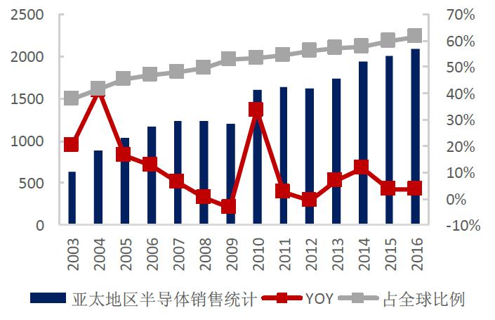 分區(qū)域來看,亞太地區(qū)主導(dǎo)地位日益顯著,占全球市場的比例有望保持在60%。全球半導(dǎo)體市場主要分布于美洲、歐洲、日本和亞太地區(qū),且市場格局相對清晰。亞太地區(qū)為第一大市場,占據(jù)全球50%以上的市場份額,其次為美洲市場,約占全球市場的20%,再者為歐洲和日本市場,兩者體量相當(dāng),均約占全球市場的10~12%。