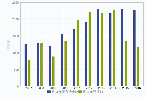 中國集成電路的進(jìn)口持續(xù)維持高位。2016年,集成電路進(jìn)口額達(dá)到2270.7億美元,比上年下降了1.2%,但是也連續(xù)四年超過了2000億美元,是價值最高的進(jìn)口商品。同期出口集成電路613.8億美元,下降11.1%,貿(mào)易逆差高達(dá)1657億美元。預(yù)計未來幾年,集成電路進(jìn)口額仍將維持高位。