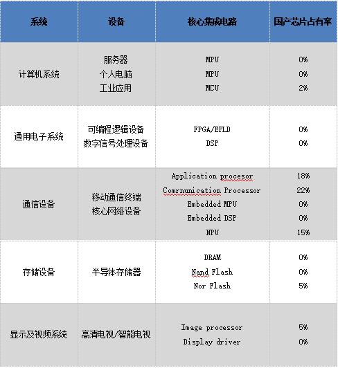 表中計算機系統(tǒng)中的MPU、通用電子系統(tǒng)中的FPGA/EPLD和DSP、通信裝備中的 Embedded mpu和DSP、存儲設(shè)備中的DRAM和 Nand flash、顯示及視頻系統(tǒng)中的 Display driver,國產(chǎn)芯片占有率都是零這就指出了一個嚴(yán)峻的問題,我國所需核心芯片主要依賴進(jìn)口。半導(dǎo)體產(chǎn)業(yè)關(guān)系國家經(jīng)濟(jì)和安全命脈,中國半導(dǎo)體從業(yè)者身肩重責(zé),必須為核心芯片國產(chǎn)化不斷努力。