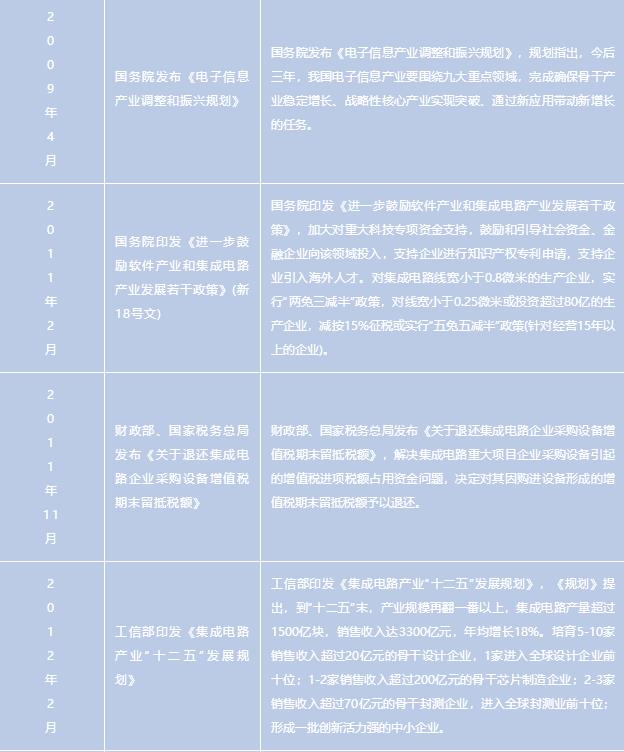 2011年出臺的《國務(wù)院關(guān)于印發(fā)進(jìn)一步鼓勵軟件產(chǎn)業(yè)和集成電路產(chǎn)業(yè)發(fā)展若干政策的通知》,提出要大力支持軟件和集成電路重大關(guān)鍵技術(shù)的研發(fā),努力實現(xiàn)關(guān)鍵技術(shù)的整體突破,加快具有自主知識產(chǎn)權(quán)技術(shù)的產(chǎn)業(yè)化和推廣應(yīng)用,重點支持高端芯片、集成電路裝備和工藝技術(shù)、集成電路關(guān)鍵材料、關(guān)鍵應(yīng)用系統(tǒng)的研發(fā)以及重要技術(shù)標(biāo)準(zhǔn)的制訂;在《電子信息制造業(yè)“十二五”發(fā)展規(guī)劃》和《集成電路產(chǎn)業(yè)“十二五”發(fā)展規(guī)劃》中也均提出要著力發(fā)展芯片設(shè)計業(yè),壯大芯片制造業(yè),開發(fā)髙性能集成電路產(chǎn)品,增強先進(jìn)和特色工藝能力。
