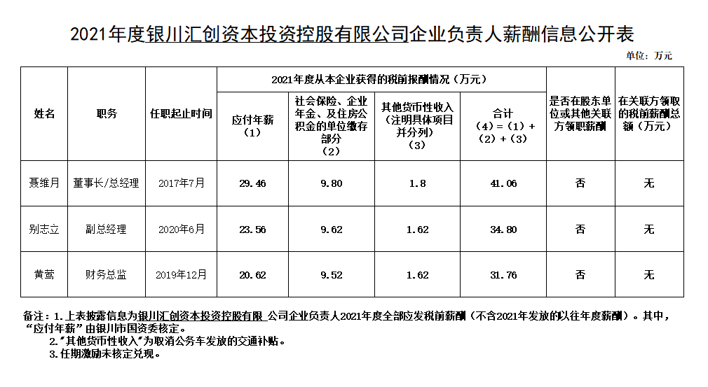 按照《銀川市屬國有企業(yè)負(fù)責(zé)人薪酬管理辦法(試行)》(銀國資發(fā)〔2021〕458號)規(guī)定,經(jīng)銀川市國資委核定,現(xiàn)將銀川匯創(chuàng)資本投資控股有限公司企業(yè)負(fù)責(zé)人2021年度薪酬信息予以披露。