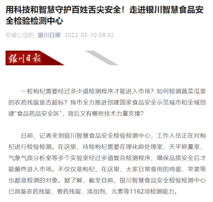 銀川匯創(chuàng)資本投資控股有限公司作為市屬國(guó)有投融資集團(tuán),聚焦公司“3+2”核心業(yè)務(wù)體系,以食品安全檢驗(yàn)檢測(cè)為依托,深化生命健康產(chǎn)業(yè)板塊發(fā)展,為助力銀川市創(chuàng)建國(guó)家食品安全示范城市和全域創(chuàng)建“食品藥品安全區(qū)”建設(shè)作出積極貢獻(xiàn),近日,公司旗下子公司銀川智慧食品安全檢驗(yàn)檢測(cè)中心工作成果得到了市內(nèi)外多家媒體的一致認(rèn)可,受到了社會(huì)各界的廣泛關(guān)注,寧夏新聞網(wǎng)、銀川日?qǐng)?bào)、銀川新聞網(wǎng)、銀川電視臺(tái)、銀川發(fā)布等媒體進(jìn)行了宣傳報(bào)道,瀟湘晨報(bào)等媒體第一時(shí)間進(jìn)行了轉(zhuǎn)載。