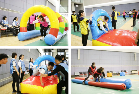 “螃蟹過河”挑戰(zhàn)團(tuán)隊(duì)協(xié)作與配合。每四人組成一只可愛的“螃蟹”,在最短的時(shí)間內(nèi)往返通過獨(dú)木橋的隊(duì)伍即獲得勝利。螃蟹服形態(tài)臃腫,褲腿相連,給隊(duì)員們?cè)鎏砹瞬簧俦荣愲y度,參賽隊(duì)員們?cè)跇O短的時(shí)間內(nèi)商量戰(zhàn)術(shù),迅速統(tǒng)一思想,賽場上他們口號(hào)整齊,步伐一致,為了完成同一個(gè)目標(biāo)而齊心協(xié)力、共同努力,在日常工作中積累的信任與默契展露無遺。